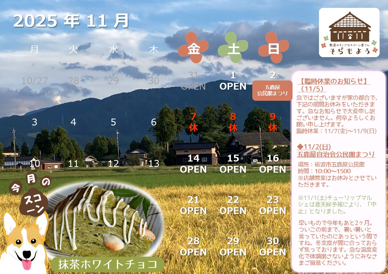 臨時休業:11/7(金)~11/9(日) - 11/2(日) 五鹿屋自治会公民館まつり