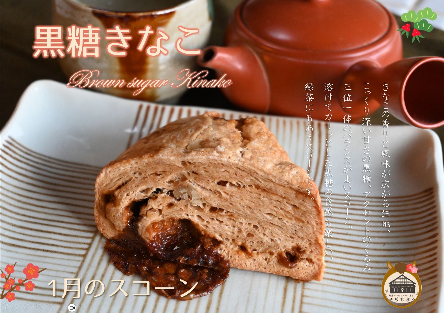 1月のスコーン「黒糖きなこ」 お知らせ 2026.01.19 黒糖きなこ ¥380 たっぷりきなこを混ぜ込んだ生地に、沖縄奄美産の黒糖を合わせた和風スコーン。きなこの甘い香り&風味とこっくり甘い黒糖がよく合います。アクセントに少しのくるみを加えました。緑茶との相性もGoodです! 詳しくは、こちら
